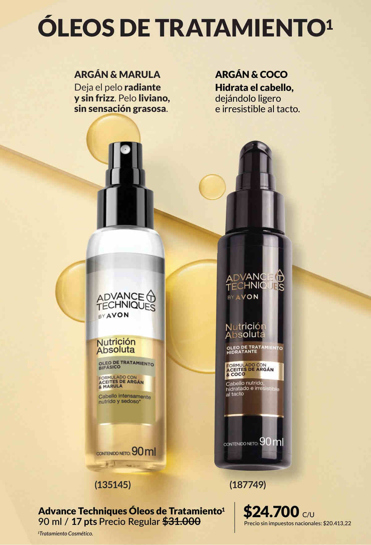 Avon Advance Techniques Argán y Camelia Tratamiento - Los óleos tienen una fórmula enriquecida con provitamina B5, derivados de vitamina E y los beneficios del aceite del fruto de Argán de Marruecos, cuyas propiedades exclusivas transforman el cabello débil y sin vida en uno fortalecido. Así el cabello seco y dañado recupera su suavidad y queda instantáneamente restaurado, radiante y suave al tacto. 90 ml.